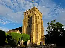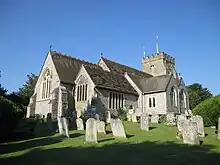 The Saxon church survived at least as late as Domesday Book, but nothing now remains of it.[8] Perhaps around 1200–1220, and certainly no later than 1250, it had been replaced by a simple nave and chancel built of Caen stone, a kind of Middle Jurassic limestone quarried in Normandy.[9][10][11][12] The chancel arch from this building can still be seen, as can two lancet windows in what is now the vestry.[13] Two aisles to north and south were built later in the 13th century, and in the 14th century the porch and the arches separating the nave from the aisles were added. There was much further building in the 15th century: the tower, a westward extension of the nave, and north of the chancel a new chapel, known as the Parham chapel.[14] This last may have been the work of Thomas Beckington, Prebendary of Henfield from 1438 to 1443.[15] In 1530 the dedication of the church, which is usually given as being to St Peter, was recorded as being to Sts Peter and Paul. In 1627 two dormer windows were added to the north aisle; those in the south aisle are of uncertain date but may be from the same period. A gallery on the south side of the church is recorded as being in place in 1718.[14]