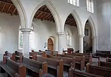 Internally, the nave measures approximately 14 metres (46 ft) by 11 metres (36 ft).[5] The roof has alternating tie beams and false hammer beams.[1] The south aisle is separated from the nave by a four-bay arcade which has octagonal piers and double chamfered arches. The aisle contains a bench sedile and a piscina.[1] The chancel measures approximately 11 metres (36 ft) by 7 metres (23 ft).[5] The south wall has three stone ogeed arches indicating the position of sedilia for the bishop, priest and deacon.[1][5] There is also an ogeed piscina; both these features of the chancel date from the 19th century.[1] To the left of the east window is a wall monument to Sir Cyril Wyche who died in 1780.[1] Sir Cyril was one of the first members of the Royal Society.[2]