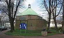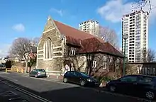 The replacement church was designed by Nugent Cachemaille-Day, and was dedicated in 1963.[9] It was one of Cachemaille-Day's last works.[10] The main body of the church is in the form of an octagon.[11] There is a lady chapel (with aumbry).[12]