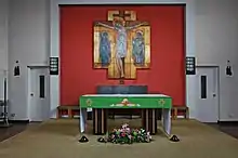 The reredos depicts the Crucifixion, with the Blessed Virgin and St John at the foot of the Cross. The ceiling depicts the four archangels (Gabriel, Michael, Raphael and Uriel) and the Holy Spirit as a dove. Both the reredos and the ceiling are the work of John Hayward.[13] Internal decorations were undertaken by Campbell, Smith & Co Ltd.[14] Stained glass is by Christopher Webb and Cachemaile-Day.[15]