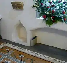 In the walls of the sanctuary are two corbels which have been re-set, and they may indicate the use of a Lenten veil. On the sanctuary floor are early 20th century memorial mosaics, with a crypt below.[11] The chancel contains a 14th century piscina with an ogee opening, but the piscina and the top of the sedilia are low on the wall to the right of the altar, indicating a raising of the stone floor which has 17th and 19th century ledgers.[8][11] It has scribed render walls. The roof was restored in 1884, and is arch-braced with 4.5 bays.[11]