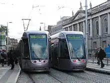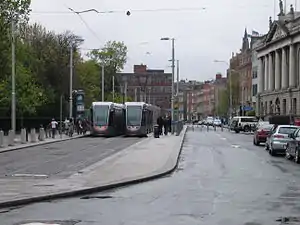 In 2017 an extension of the Luas Green Line was opened, crossing the River Liffey, and intersecting with the Red Line at the junction between O'Connell Street and Abbey Street, terminating at Broombridge, interconnecting with the Irish Rail Broombridge railway station.[2] Named the "Luas Cross City line", this project was announced in 2011 as part of the government's 2012–16 Infrastructure and Capital Investment Plan.[3] Construction work for the Rosie Hackett Bridge across the River Liffey began in April 2012, with this bridge carrying the southbound Luas Cross City track.[4] The existing St. Stephen's Green stop on the Luas Green Line subsequently became a through-point for the new line,[5] with the stop's platforms extended to accommodate the proposed introduction of longer trams in 2018.[6] The extension opened on 9 December 2017,[5] with the St. Stephen's Green stop remaining operational throughout the works.[7]