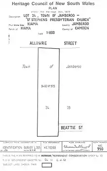 On 5 May 1979 the Presbyterian Church of Australia nominated St Stephen's Presbyterian Church Jamberoo. A Permanent Conservation Order was placed over the Church on 6 April 1981. It was transferred to the State Heritage Register on 2 April 1999.[1]