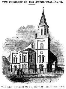 St Thomas Charterhouse was a Church of England church built in 1842 by the noted Victorian architect Edward Blore, who also designed Buckingham Palace. The church was closed in 1906 and was subsequently demolished in 1909.