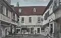 In 1465, work started on the present building. This courtyard structure may incorporate parts of two earlier houses. It included a great hall to the north, with a chapel to its east. The hall survives in part, but its ceiling has been lowered and the plasterwork was replaced in 1910. The posts of a screens passage also remain, the other side of which is the fireplace of the original kitchen. It has been suggested that doorways led off the courtyard to staircases, with rooms for the provost and fellows of the college leading off them.[3] While the college was not a monastic establishment, it was affected by the Dissolution of the Monasteries, as in 1548 the building was converted to a substantial house, with later tenants including Charles Howard, 3rd Earl of Carlisle. Around this time, a single main staircase was added, which survives, while a room to the south-west has remains of wall paintings from this era. In the seventeenth century, the "Bishop's Chamber" was created on the first floor, to the west of the great hall, and it survives largely intact. In the eighteenth-century, part of the ground floor was used for retail, and bow windows were added, which still survive. Otherwise, the façade generally survives as built, with an ashlar ground floor and a timber-framed, jettied upper floor. The doorway itself is a replacement, but the coats of arms above are from about 1670, and carvings of Saint Christopher and the Virgin and Child either side of the entrance also survive.[3]