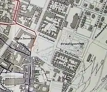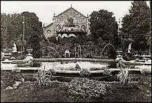 Part of the city garden of Freiburg was still the northerly located festival hall.[5] Its construction was already planned for the Baden Singer Festival ("Badisches Sängerfest") which took place in 1846. However, the building only began on 10 August 1846; the roof truss was erected on 2 October 1847, and the provisionally completed hall subsequently used as depot and casern in the Baden Revolution. Only when the riots ceased, the construction was continued in 1852 and the festival hall was opened two years later. The plans for the festival hall came from Friedrich Eisenlohr , the constructer was the Freiburg architect Schneider. The hall was destroyed in the night of bombing on 27 November 1944 and has not been rebuilt afterwards. Today, the rose garden is situated in the hall's former location.[6] Trade fairs and exhibitions have taken place in the town and fair hall in eastern Wiehre located at "Alter Messplatz" since 1954, until they were relocated at the Messe Freiburg in 1999. The premises of the former festival hall including the area opposite Leopoldstraße which does not exist anymore were added to the city garden.