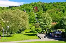 The city garden was created as a result of the "Oberrheinische Gewerbeausstellung" (Upper Rhine Industrial Exhibition*) of 1887, which had taken place on Karlsplatz, the former drill and measuring station. As late as 1887, the city gardener Schmöger was commissioned to design and build the something similar. The park was already completed and opened in 1888, and even charged an entry fee until 1911.[3] The original features included an aquarium, music pavilion, fountain and a children's playground. In addition to this, there was an enclosure with a Rhesus Monkey named Anne, which is now displayed in the Museum of Nature and Men.[4] Starting from 1889, there were areas in the western Schlossberg which were created as a forest park. As a consequence of the First World War, the care was clearly neglected, though the terrain was redesigned from 1920 to 1924. Due to the air attack on the city (Operation Tigerfish), the concert hall and park were destroyed, and the park remained in this form. After the Second World War, the City Garden was restored. This began in 1948 with the filing of the bomb craters and the clearing of the paths; this partial reconstruction was part of the Baden Industry and Trade Exhibition ("Badische Industrie- und Gewerbeausstellung"). From 1952 on the park has been being wholly restored and even expanded northwards, taking in the area of the former festival hall. In 1967 its southern area was reduced to clear a space for the construction of the Leopoldring. Eventually, in the 1960s the cable car to the restaurant "Dattler" was built which was already planned before in 1914.