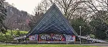 The music pavilion was designed by Max Scherberger, who was also stress analyst of the Schlossbergturm (Schlossberg tower), and built in 1969. The shape of the roof is a hyperbolic paraboloid. The bent surface of the unsupported roof are assembled with straight wooden elements. It was the first roof in the Federal Republic of Germany built in that way. The abutment made of concrete was drafted by Immo Kirsch, then head of the department for building construction. In summer 2015, during a routine check water was detected within the roof. This meant that there was a danger of the building collapsing. Originally, the renovation was planned to be finished by July 2016, but due to rainy weather the completion was postponed to September when events started to take place again.[7] Im September konnten jedoch wieder Veranstaltungen stattfinden.[8]