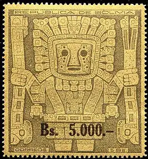 The Staff God has one of the most important iconographical elements in central Andean archaeology and this is prominent in both portable and fixed art using different media such as stone, textile, and ceramic.[16] A form of the staff god, for example, takes a central role in the Sun Gate of the Tiwanaku culture, a single-stone monolith. Tunics and ceramics from both the Tiwanaku and Wari cultures of the Middle Horizon period showcase a similar god. Another example is the giant offering jars found at Qunchupata. They were painted with the Staff-God's image, one that bears resemblance to the god's depiction at the back of the Tiwanaku's Ponce Monolith.[18]