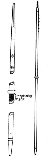 The M1893nA was a slight variation on the M1890.[1] For the first time the haft was made from drawn, soft steel and was 36 millimetres (1.4 in) in diameter.[2] The point, still quadrangular in section, was made slightly thicker.[1][2] The lance is described by Kruszyński (2021) as measuring 3.2 metres (10 ft 6 in) but by Larson and Yallop (2017) as measuring 10 feet 3+1⁄2 inches (3.137 m), both sources agree that the lance weighed 2.12 kilograms (4 lb 11 oz).[2][1] There was a brass handle, lined with cloth, at the mid-point of the lance. One third from the base was a brass ring with leather tassel that was used to carry the lance (the conical base fitted into a leather sleeve at the cavalryman's right stirrup).[2]