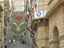 Scalinata di Santa Maria del Monte is a set of world-famous steps in Caltagirone, Sicily, Italy. It was built in 1606 in order to connect the ancient part of Caltagirone to the new city built in the upper part. The staircase, over 130 meters (430 ft) long, is flanked by balcony buildings and is today one of the identifying monuments of the city.