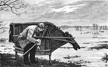 The term stalking horse originally derived from the practice of hunting,[1] particularly of wildfowl.[2] Hunters noticed that many birds would flee immediately on the approach of humans, but would tolerate the close presence of animals such as horses and cattle. Hunters would therefore slowly approach their quarry by walking alongside their horses, keeping their upper bodies out of sight until the flock was within firing range. Animals trained for this purpose were called stalking horses. Sometimes mobile hides are used for a similar purpose.