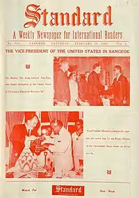 The Standard was an English-language weekly newspaper whose first issue was published in Thailand on 8 June 1946.[1] On 26 February 1966, starting from issue no. 1000 it was renamed Standard International until it was merged on 14 April 1968 with Bangkok World, Sunday Magazine Section to form Standard Bangkok magazine.[2][3][4] The Standard presented a summary of local and international news and featured articles on domestic and foreign affairs. It emphasized news of society and the royal family. It was widely read by foreigners and English-speaking Thai for its coverage of social events.[5][6]