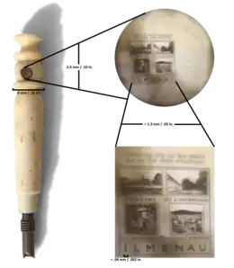 The sectioned lens could magnify the microphotograph three hundred times,[4] so that the viewing of the microphotographs no longer required a bulky and expensive microscope. The modified Stanhope lens was small enough to be mounted in all manner of miniature artifacts such as rings, ivory miniatures, wooden toys etc.[1] Dagron also designed a special microphotographic camera which could produce 450 exposures approximately 2 by 2 millimetres (0.079 in × 0.079 in) on a 4.5-by-8.5-centimetre (1.8 in × 3.3 in) wet collodion plate.[5]
