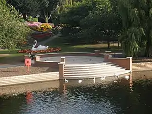 The park is notable for containing a large concrete sculpture of a swan, which has been described as a "Burton landmark".[9] The sculpture, which also functions as a planter, was constructed by the borough council in 1953. Which of four competing symbolisms applies is unknown:
