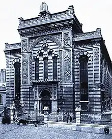 The 1861 building was replaced between 1897 and 1900 by an elaborate Moorish Revival synagogue designed by Adolf Zeligson, a well-known Łódź architect. The architect's signed plans for the building were auctioned at Sotheby's on December 17, 2008, for $13,750.[6]