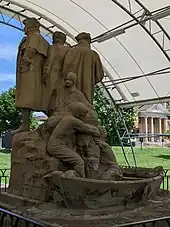 Borglum designed the memorial at his studio in San Antonio, Texas in late 1936 and 1937, working in plaster of Paris.[1][4] From this full-scale rendering, a small clay maquette was made, and given to stonemasons engaged using Works Progress Administration funding as part of the New Deal.[1] They sculpted the design from an 80-short-ton (73 t) block of sandstone from a quarry near the old lock number 18 on the Ohio River at a workshop at Briggs Station.[1][4]