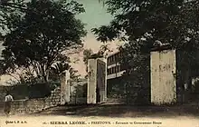 The State House is located on State Avenue, Tower Hill, in central Freetown.[1] It stands on the site of Fort Thornton, built from ca. 1792 to 1805 and named after Henry Thornton. Inside of it was Government House, the seat of the British governor. Although it was being continually repaired and Jane Drew made alterations to it after the war,[2] it was soon after considered "to be nearing the end of its useful life".[3] In 1949 plans for a new Government House were presented to the public.[4] They had been prepared by the senior architect of the Public Works Department, Robin Halliday Macartney, who was entirely responsible for the design and the construction.[5] After several delays the building was finished in 1954 and the governor, Sir Robert Hall, moved in in February.[6] At the express wish of the governor, "the fortification walls should be retained on account of their aesthetic and historical value."[7] Therefore, the walls were declared National Monuments in 1949.[8] As the old walls were of uncertain strength, "it was deemed prudent to place no great load on them".[9] The old bastion walls can be seen from the gate.