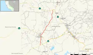 Except where prefixed with a letter, postmiles were measured on the road as it was in 1964, based on the alignment that existed at the time, and do not necessarily reflect current mileage. R reflects a realignment in the route since then, M indicates a second realignment, L refers to an overlap due to a correction or change, and T indicates postmiles classified as temporary (for a full list of prefixes, see California postmile § Official postmile definitions).[7] Segments that remain unconstructed or have been relinquished to local control may be omitted. The entire route is in Amador County.