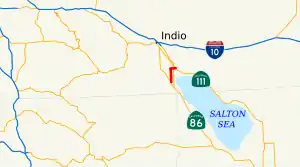 Route 64, a highway from Mecca to Blythe, was added to the state highway system in 1919.[7] In 1935, Pierce Street from Route 26 near Oasis to Avenue 66, and Avenue 66 from Route 26 to Mecca were added to the state highway system.[8] Two years later, Pierce Street was designated as Route 203, and Avenue 66 was designated as Route 204.[9] By 1926, the road existed east of Mecca to Blythe, but was unpaved;[10] by 1930, the road connected from Mecca to the road along the western side of the Salton Sea to Indio and points further west.[11]