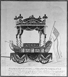 The king replied with his approval on 11 November. Shortly afterwards, the unpopular Prince of Wales (later King George IV), announced that he would be the chief mourner, which William Nelson assented to, but the government were appalled at the suggestion and referred the matter to the king, who ruled that a naval officer should fill the role.[16] The two most senior officers were the First Lord of the Admiralty, Lord Barham and Sir Peter Parker and it was Parker who was finally appointed.[17]