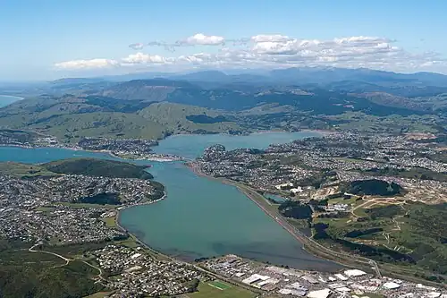 Aerial view of Porirua Harbour encompassing several State housing suburbs