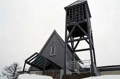 In the 1960s, work began towards building an annex chapel in Stathelle. It was designed by Bjørn Ljungberg. It is a brick building that is partly clad with wood. The nave and chancel are in the same room, giving it a rectangular design. There is a church hall in the room next to the main room too. There is a church porch at the main entrance, there is a second floor seating gallery above the porch, and a bell tower about that. The new church was consecrated by the bishop on 7 May 1964. The church was originally called a chapel, but in the 1990s, the church was made a full parish church and renamed as a church. The building was enlarged in 1988 and again in 2011.[4][5]