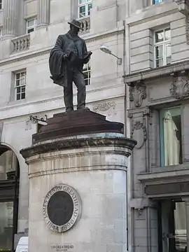 The statue of James Henry Greathead, designed by James Butler, is installed outside the Royal Exchange, where it conceals a ventilation shaft. It was erected in 1994 on a traffic island in the middle of Cornhill, London, with traffic passing to either side, similar to the statue of Prince Albert at Holborn Circus.[1] The London Troops War Memorial is nearby.