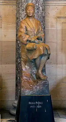 Rosa Parks is a 2013 bronze sculpture depicting the African-American civil rights activist of the same name, installed in the United States Capitol's National Statuary Hall, as part of the collection of the Architect of the Capitol. The statue was sculpted by Eugene Daub and co-designed by Rob Firmin.[1] It is the only statue in the Hall not linked with a state, and the first full-length statue of an African American in the Capitol.[1]