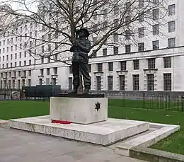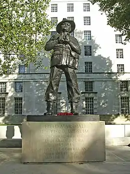 The statue of William Slim, 1st Viscount Slim in Whitehall, London, is a work of 1988–1993 by the sculptor Ivor Roberts-Jones. It is one of three memorials to British military leaders of World War II on Raleigh Green, outside the Ministry of Defence's Main Building, the others being Oscar Nemon's 1980 statue of Lord Montgomery and Roberts-Jones's statue of Lord Alanbrooke, erected later in 1993. Slim's bronze statue stands approximately 3 metres (9.8 ft) high on a pedestal of Portland stone.