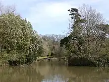 The park contains a lake called Leigh water.[15] Prior to its construction the site was home to a pond a few yards in diameter.[16] Its initial construction of the lake took place between 1828 and 1836.[15] A three arched bridge known as the Chinese Bridge was built in 1830[15] and in 1832 two buildings were added; a boathouse apparently built to a Chinese design and a pergola.[17] In either 1832 or 1834 an ornamental kiosk was added to the lakeside.[18] It featured an onion dome surrounded by small minarets. In 1835 a Chinese-themed summer house was built by the site of the lake.[18]