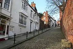 The bottom leads to The Strait. Three-quarters of the way up is the junction with Wordsworth Street, on which is Chad Varah House, the former home of the Departments of Conservation & Restoration and History of Art & Design of the University of Lincoln, and of the Lincoln School of Theology, currently being converted into dwellings. From this junction, the road narrows and leads past the Wig & Mitre pub and Brown's Pie Shop and to Castle Hill to the left and Exchequergate to the right.