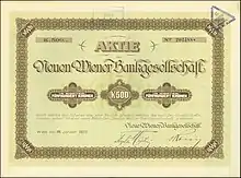 After World War I, he was elected president of the newly founded Neue Wiener Bankgesellschaft in 1921, of which Isidor Mautner was the main shareholder.[4] The Vienna banking crisis of 1924 brought this institution to the brink of bankruptcy, and business could only be continued by Isidor Mautner pledging his real estate holdings with the Austrian National Bank. On 31 October 1926 he dissolved the bank, which contributed significantly to the collapse of his father's corporate empire.
