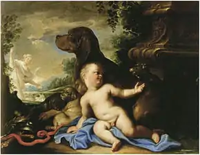 Stefano Camogli was a master of flower painting, still lifes of fruit and animals, which he depicted very truthfully. He also painted genre paintings of pantries and markets in a style inspired by his teacher Jan Roos.[5] Like his master Roos, Camogli was also capable of painting the human figure as is shown in a set of history paintings attributed to him.[4]