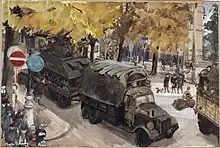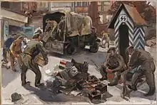 In December 1941, Schmolle applied to join the Art Department of the Ministry of Information but was not accepted. However the War Artists' Advisory Committee, WAAC, of the same Ministry agreed to assist her in obtaining materials to continue working as an artist during the Second World War. In 1942, Schmolle was conscripted into the Auxiliary Territorial Service, ATS, and initially did camouflage work before becoming an draughtswomen to an ATS intelligence officer.[2] She served with the ATS in both Britain and, following the D-Day landings in 1944, also France and Belgium.[4] During this period she continued to paint. Her subjects included scenes showing French collaborators in Normandy, British troops clearing an SS headquarters in Brussels and both ATS and civilian activities in Britain.[5] Eventually seventeen of these pictures were purchased by the War Artists Advisory Committee.