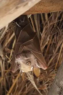 Cannon later took a trip to Thailand, where she felt that she belonged despite not knowing the Thai language. The connection she felt to the Thai people despite their differences in language and culture caused her to ask herself, "How can we be so different, yet feel so much the same?"[2] This question lead her to consider writing a story where the theme was "overlooking differences in order to find common ground."[2] When she returned to California, she began to create a children's book with this theme that featured bats; creating this book took several years.[2] She credits the work of bat scientist and photographer Merlin Tuttle as part of her inspiration for Stellaluna. Specifically, she referred to Tuttle's 1986 National Geographic article, "Gentle Flyers of the African Night", which was about epauletted fruit bats.[3][4] Cannon's characters were Gambian epauletted fruit bats, which she chose for their dog-like qualities and friendly-looking features.[5]