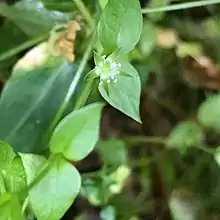 Stellaria crispa is a species of flowering plant in the family Caryophyllaceae known by the common names curled starwort[1] and crisp starwort. It is native to western North America from Alaska south to California and Wyoming, where it grows in moist, shady habitat such as deep forests and streambanks. It is a rhizomatous perennial herb producing a mat of prostrate or trailing stems up to about 40 centimeters long. It is lined with opposite pairs of pointed oval leaves each 1 to 2 centimeters long. Single flowers occur in the leaf axils, each borne on a short pedicel. The flower has five pointed green sepals each a few millimeters long. Some flowers have one or more petals, but most lack these.