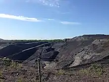 The mine began operations in 1996 and coal is extracted using truck and shovel mining. Coal mining has taken place in this area of Pictou County for more than 400 years, and until the Donkin Mine reopened in 2017,[1] the pit was the only operating coal mine in Nova Scotia.[2] Underground mining previously took place in the area where the Stellarton pit is located[3] and occasionally remnants of the abandoned tunnels from underground mining can be seen on the pit walls.[2] Once coal has been extracted, the surface is restored through reclamation.