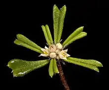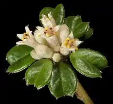 Stenanthemum is a genus of flowering plants family Rhamnaceae and is endemic to Australia. Plants in the genus Stenanthemum are small shrubs usually lacking spines. The leaves are arranged alternately along the branches, simple, usually folded in half lengthwise on a short petiole. The flowers are arranged in dense heads, usually on the ends of branches with bracts at the base of the flowers, and there are sometimes whitish floral leaves. The flowers are bisexual, more or less sessile and have five sepals, five petals and a tube-shaped hypanthium, the petals hooded over the stamens. The fruit is a schizocarp containing spotted or mottled seeds.[2][3][4]