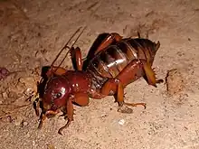 No species have wings with sound-producing structures; moreover, evidently none has structures it could use to hear sound.[3][4] This contrasts with true crickets and katydids, who use their wings to produce sounds and have hearing organs to sense sounds of others. Jerusalem crickets seem unable to hiss by forcing air through their spiracles, as some beetles and cockroaches do. Instead, the few Jerusalem crickets that do make sound rub their hind legs against the sides of the abdomen, producing a rasping, hissing noise. This hiss may serve to deter predators rather than to communicate with other crickets. For such purposes, Jerusalem crickets rely on substrate vibrations felt by subgenual organs located in all six of the insect's legs.[5]