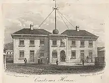 During this time he was a keen amateur astronomer and member of the Wellington Athenaeum and Mechanics Institute (the Wellington Independent on 23 January 1866 reported the theft of one of his telescopes).[5] He was also interested in chronometry, helping to repair the clock in St Peter's Church on Willis Street.[5] Both these interests possibly hearkened back to his years at sea.[2] In 1862 Carkeek suggested that a transit observatory and time ball – the first in New Zealand – be added to the new Customs House due to be built on reclaimed land on the Wellington waterfront; a time service was important for captains of visiting ships needing to correct their chronometers.[5] In December 1863 an astronomical clock arrived from Britain, and it was connected electrically to the time ball so that the ball dropped at noon each day (but never on Sundays).[5] The time ball began operation on 8 March 1864. Carkeek used a 23-inch transit instrument in the adjacent observatory to establish its longitude (174° 49′ 15′′).[5] The combined facility was known as the Provincial Observatory; at the time of its first drop, Carkeek claimed the time ball was the first in the Southern Hemisphere, and himself the country's first astronomer.[10][3]