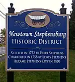 The town surveyed its older buildings to establish architectural significance and to determine those that contributed to the town's historic center. The Newtown–Stephensburg Historic District was listed on the National Register of Historic Places in August 1992.[28] Among the contributing properties to the historic district are numerous 18th-century buildings, 19th-and-early-20th century homes and businesses, cemeteries, churches, and a school complex.[28]