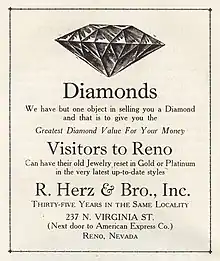 {{cite book}}: CS1 maint: date and year (link) - 1 2 "Ad for R. Herz & Bro. Jewelers". Reno Divorce History. Retrieved 2021-08-31.
