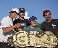 ![]() First place winner Jiro Platt holds his trophy surrounded by Steve Rodriguez, Cooper Qua, and Nicholas Ramos at the 2019 Battle at the Beach - Far Rockaway Skatepark, Queens, NY | |