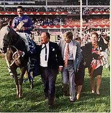 Stavro's interest in horse racing began in 1967 when he acquired a pair of yearlings – Boy Bandit and Danforth Dan. They were conditioned by J. C. Meyer.[22] However, it wasn't until the early 1980s that Stavro became passionate about thoroughbreds. As his passion grew, he founded Knob Hill Stable in Newmarket Ontario. At the peak of Knob Hill Stables, there were more than 60 horses which included 15 or more racers at Woodbine Racetrack.