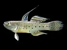 There are two dorsal fins on this gray-blue fish: the first consists of about six stiffly held rays (often with a black blotch); the second is equal in length to the long-based anal fin. Both carry dark spots.[3] This species can reach a length of 9 centimetres (3.5 in) SL.[1]