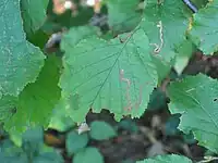 The larvae feed on Carpinus betulus, Corylus avellana, Corylus maxima and Ostrya carpinifolia. They mine the leaves of their host plant. The mine consists of a slender, gradually widening corridor. The last section is considerably wider than the larva. The trajectory of the mine is not angular and is independent of the leaf venation. Pupation takes place outside of the mine.[7]