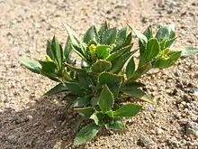 Stillingia spinulosa is a species of flowering plant in the euphorb family known by the common name annual toothleaf.[1] It is native to the Southwestern United States where it occurs in the creosote scrub of the deserts. It is an annual or perennial herb producing a clump of thick, leafy stems approaching a meter in maximum height. The alternately arranged leaves have shiny pointed oval blades 2 to 4 centimeters long and up to 1.2 centimeters wide which are lined with sharp teeth. The inflorescence is a stout spike of flowers 1 to 2 centimeters long. The plant is monoecious, and each spike has several male flowers at the tip and 1 or 2 fruit-bearing female flowers below these. Neither type of flower has petals. The ovary of the female flower develops into a three-lobed greenish capsule about half a centimeter wide. There is a tiny rough-surfaced seed in each of the three chambers of the fruit.
