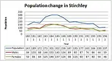 The population of Stirchley has been inconsistent from when the census records began in 1801.[7] In general the population rose until 1851 where there were 302 people living in the Parish, but soon after it declined and by 1891 the population was reduced by as much as 42.1%.[7] From the beginning of the 20th century there were not any large scale demographic variations until the census in 1951 revealed 66 people died,[7] most likely from the first and second World Wars.[16] However, since Stirchley and Brookside combined as one Council Parish,[16] the penultimately recent Census data in 2001[1] shows a much larger population and it is hard to define how much the population has increased just in the area of Stirchley.