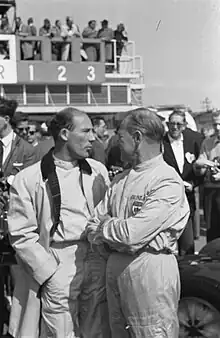 Moss's first World Championship victory came at the 1955 British Grand Prix, a race he was also the first British driver to win.[24] Leading a 1–2–3–4 finish for Mercedes, it was the first time he had beaten Fangio, his teammate, rival, friend and mentor. It has been suggested that Fangio allowed Moss to win in front of his home crowd. Moss himself asked Fangio this repeatedly, and Fangio would always reply with: "No. You were just better than me that day."[25] The same year, Moss also won the RAC Tourist Trophy,[26] the Targa Florio (with Peter Collins)[27] and the Mille Miglia.[28]